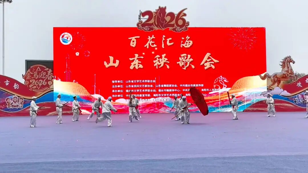3月1日,2026“百花汇海”山东秧歌会在烟台海阳举行,来自省内外的20支秧歌类队伍同台竞演,共展风华。其中,由东昌府区梁水镇梁闸秧歌队表演的聊城运河秧歌伞棒舞凭借刚柔并济的舞姿、深厚的运河文化底蕴,赢得现场观众阵阵喝彩,荣获“优秀团队表演奖”。
